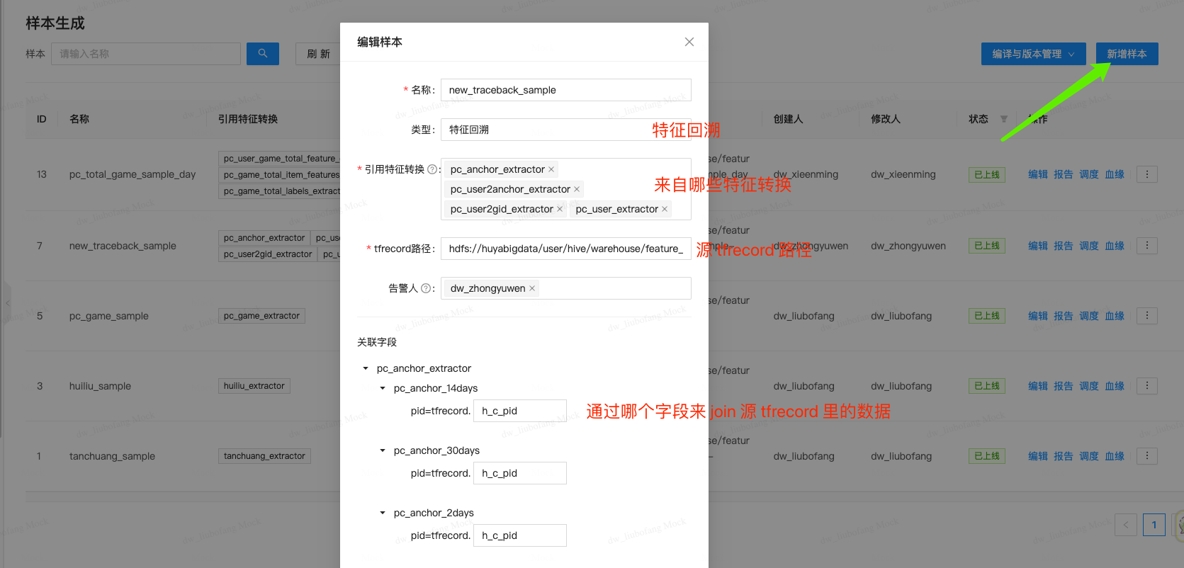 用途:当在某个旧tfreocrd样本中,新加了一些特征,需要进行离线训练时,可以不用等待累积新特征数据,而是直接通过回溯功能,回溯出这些新特征的历史tfrecord样本数据,减少累积等待时间