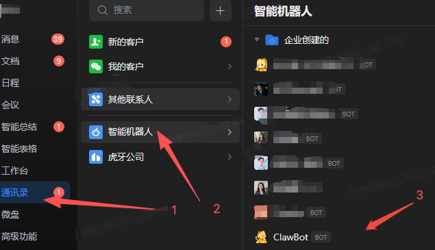- 在企微找到ClawBot这个机器人聊天即可: