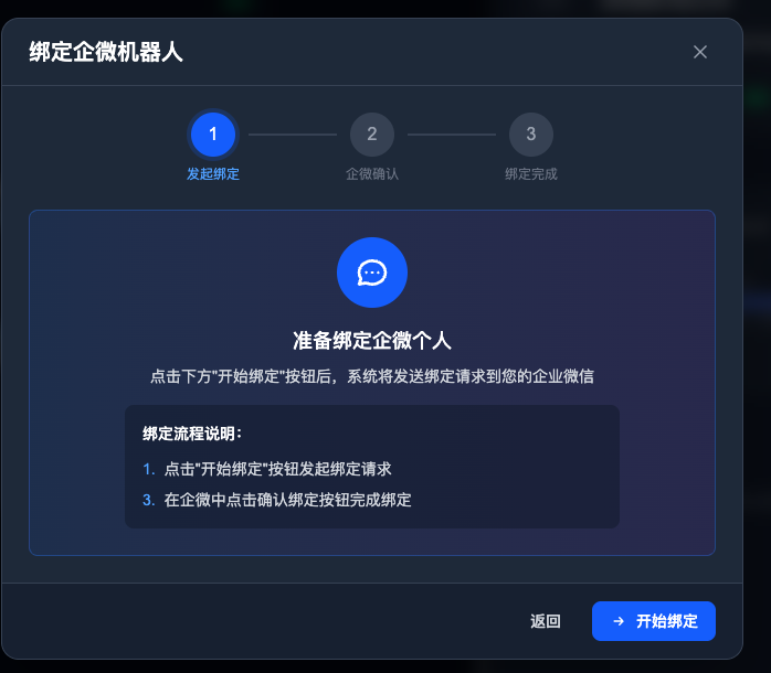 - 在平台上点击绑定企微机器人按钮