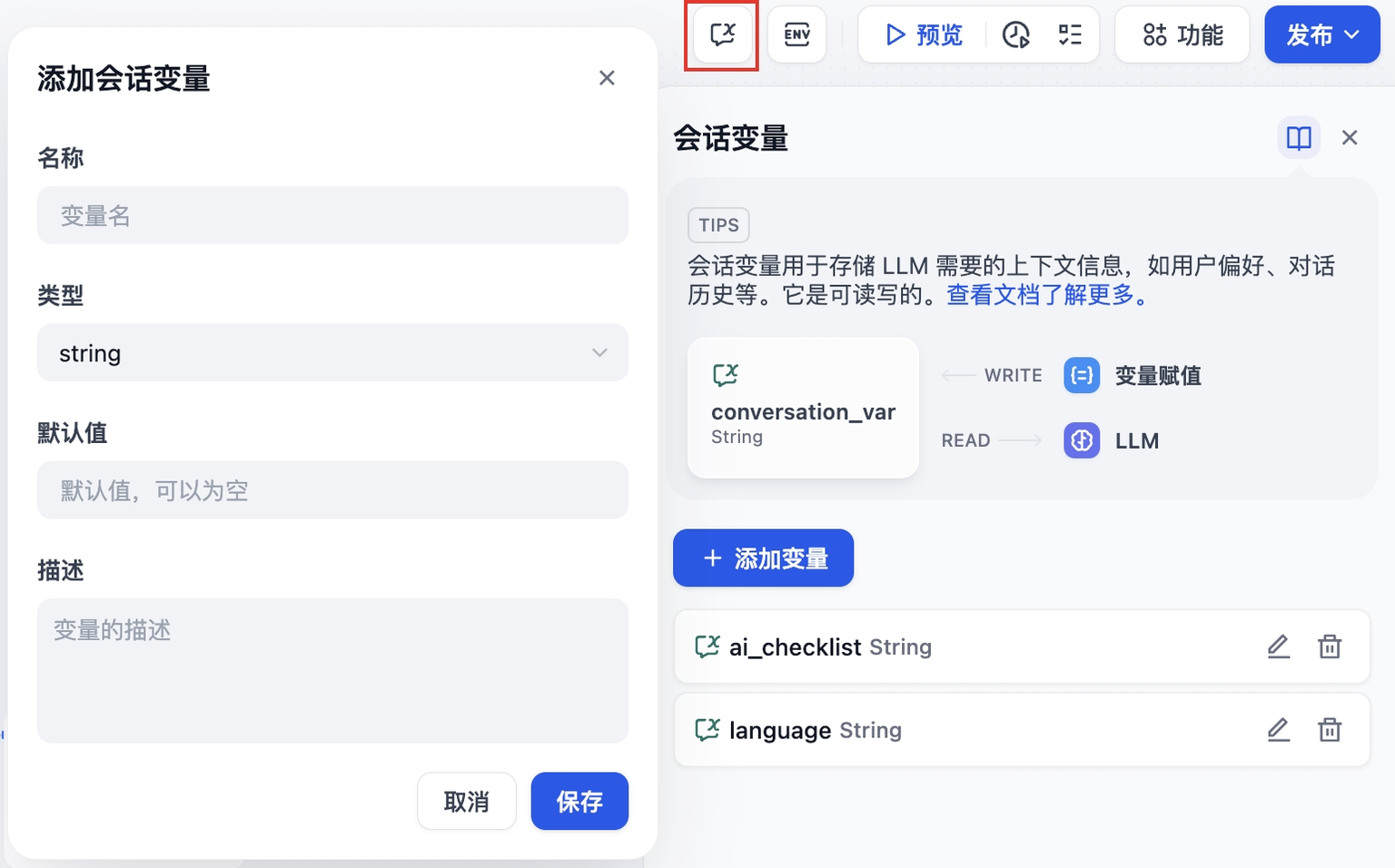 变量用于串联工作流内前后节点的输入与输出,实现流程中的复杂处理逻辑,包含系统变量、环境变量和会话变量。详细说明请参考变量章节。