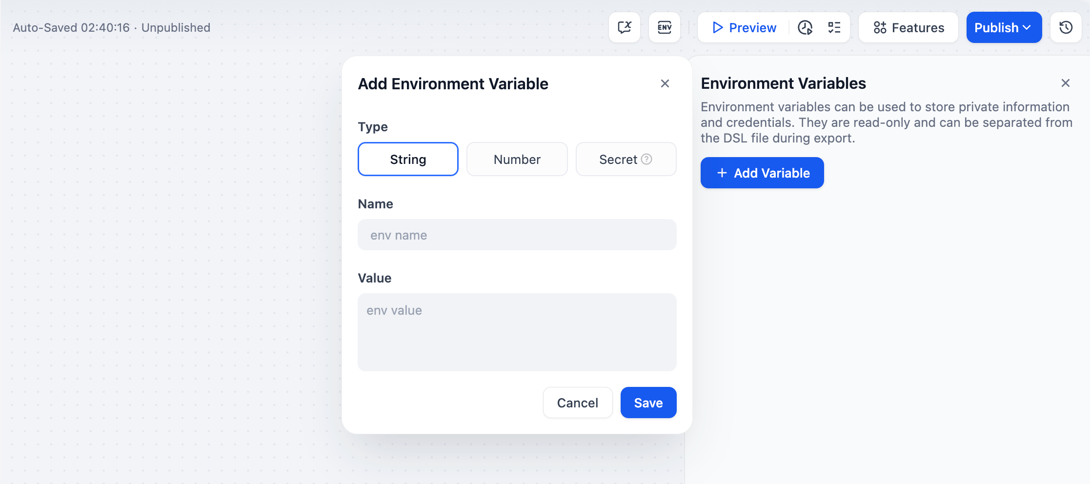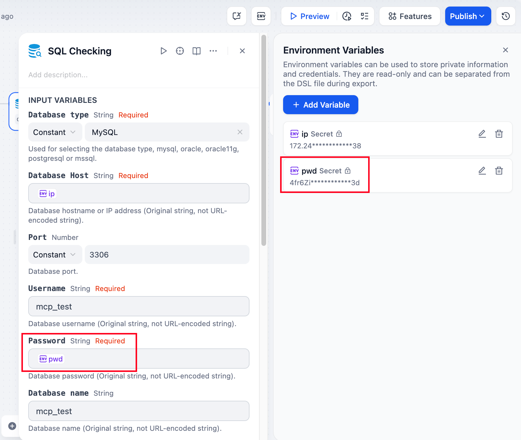 环境变量用于保护工作流内所涉及的敏感信息,例如运行工作流时所涉及的 API 密钥、数据库密码等。它们被存储在工作流程中,而不是代码中,以便在不同环境中共享。
