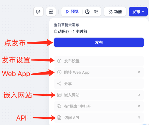草稿 ──> 发布 ──├──> API (通过API调用,可以集成到其它系统或外部触发运行)