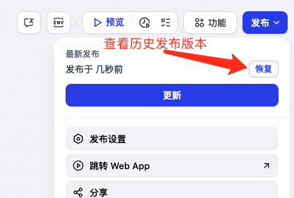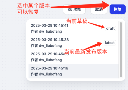 可点击某个版本预览历史版本,如果确认要恢复至某个版本,点击恢复,当前草稿会恢复至那个版本,确认没问题后,可以将当前草稿发布: