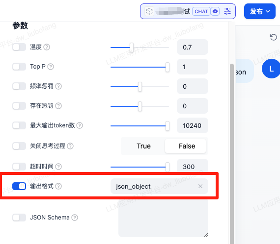 如图所示,此方式设置很简单,直接在模型设置中,设置输出格式为json_object即可,需要在提示词中给出预期的json结构。