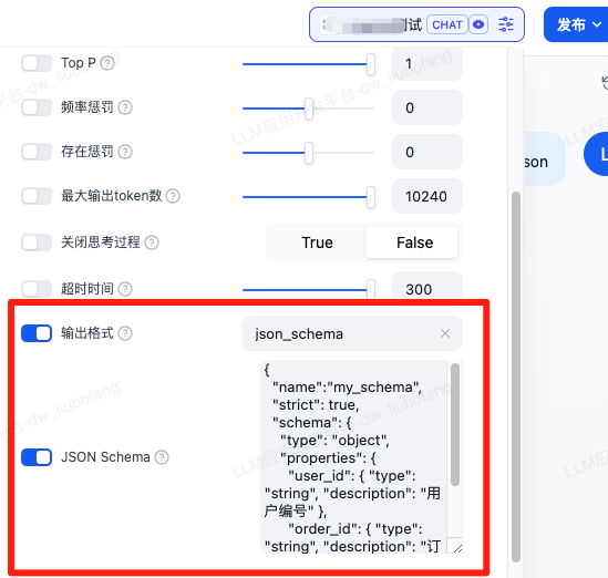 | 配置方式 | { "name":"my_schema", "strict": true, "schema": {...} } | 选择输出格式为json_object,提示词中定义格式 |