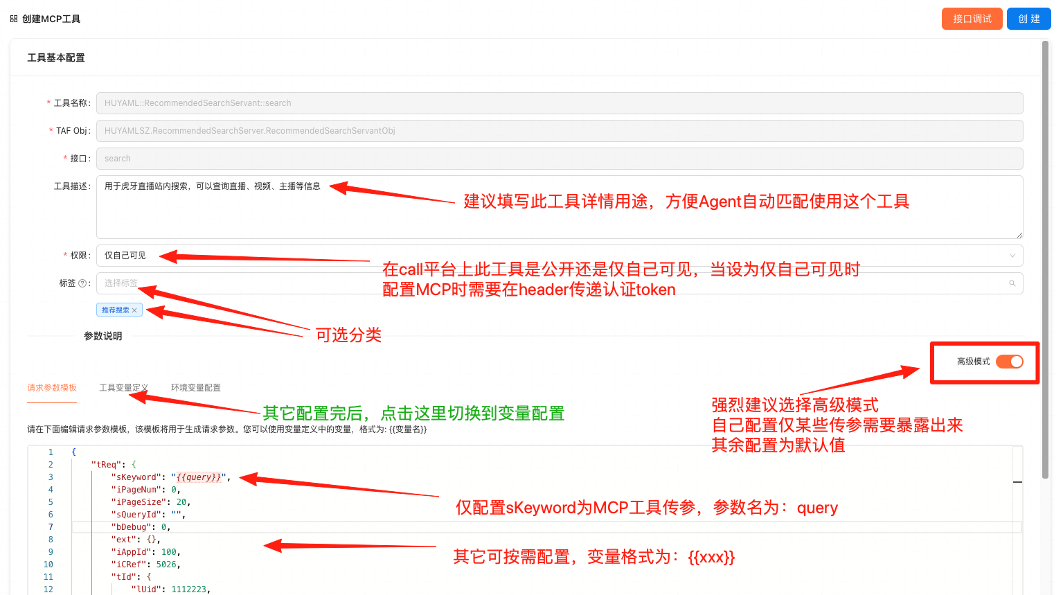 按下图编辑MCP配置,强烈建议使用高级模式指定配置某些参数可见,避免暴露所有参数
