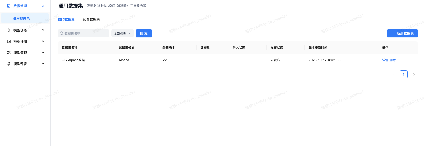 我的数据集列表页面,展示用户创建的所有数据集及其基本信息。
