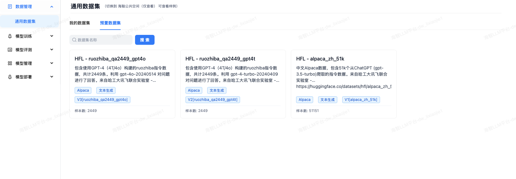 预置数据集列表页面,展示平台提供的公共数据集。