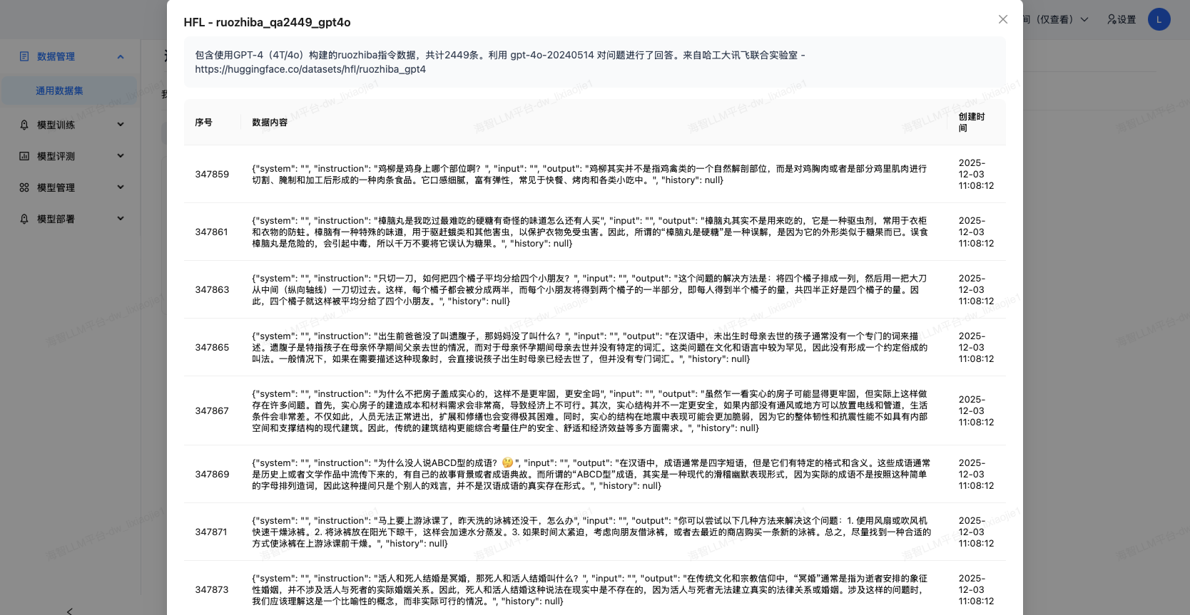 点击预置的数据集,可以查看数据集的介绍和样本内容。