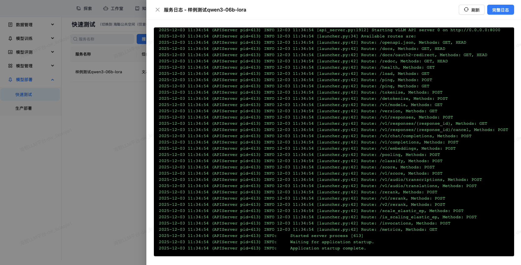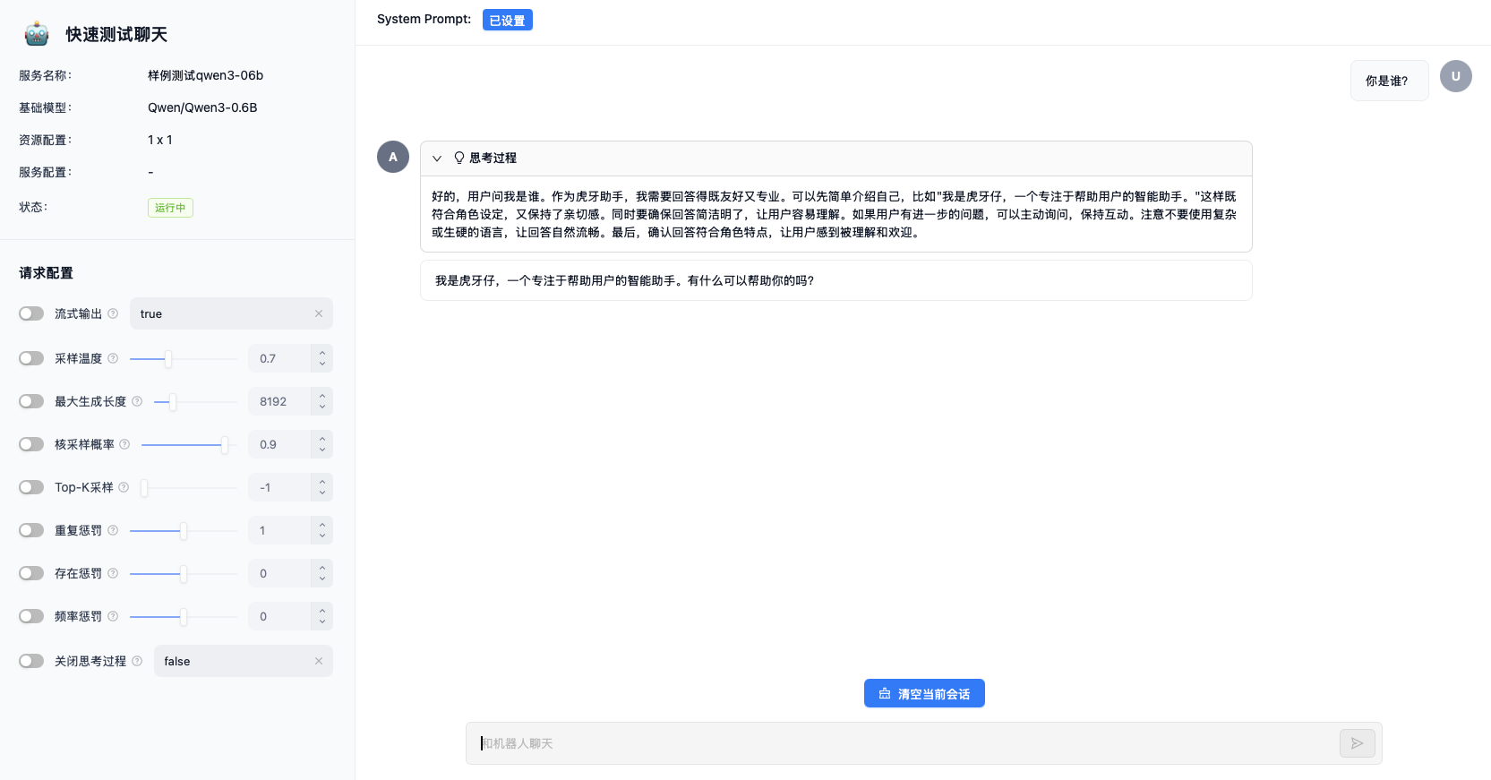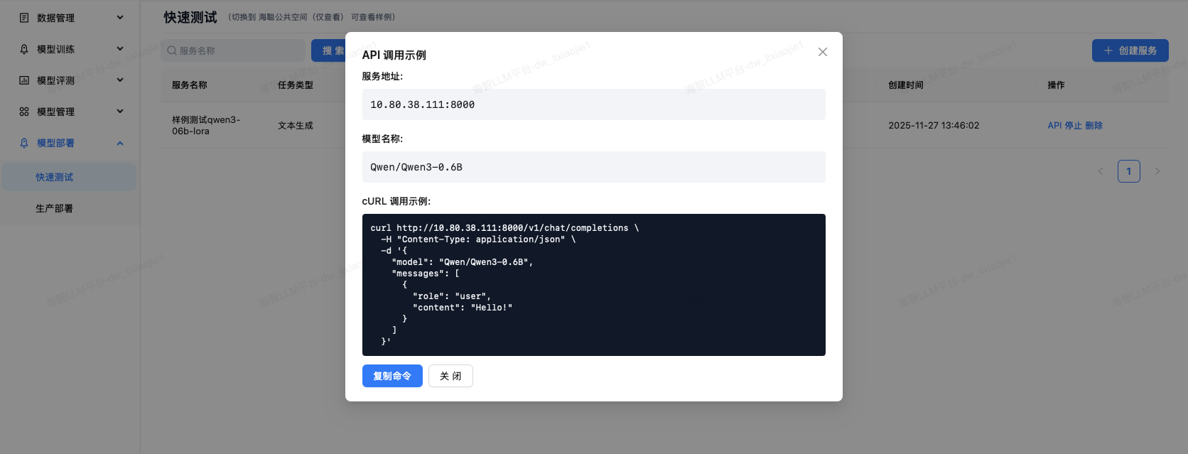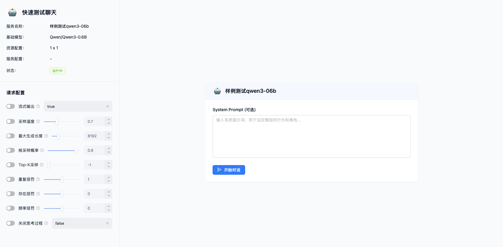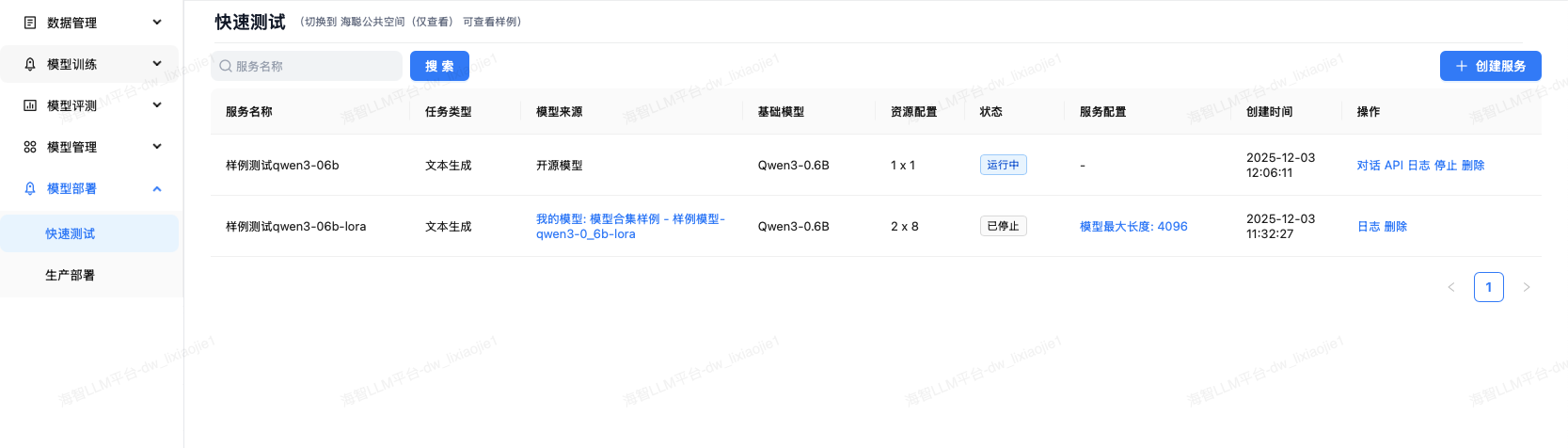 快速测试提供训练结果/我的模型/开源模型的临时快速部署,用户可通过对话页面或API完成模型的快速功能验证。