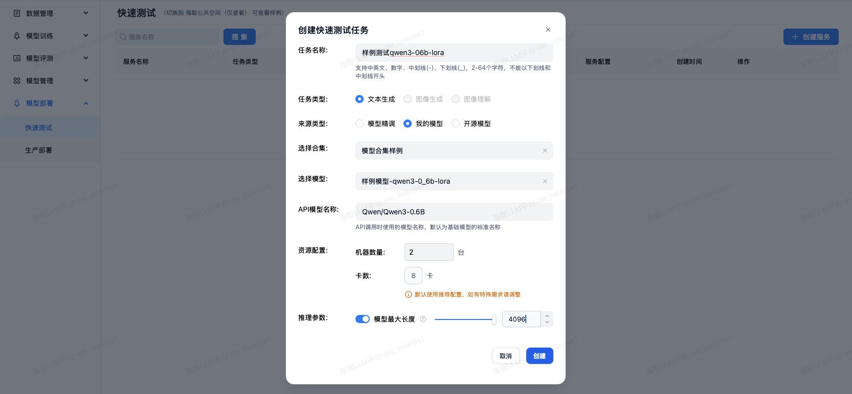 快速测试可选择多种模型来源,支持多机多卡以及推理参数的配置。