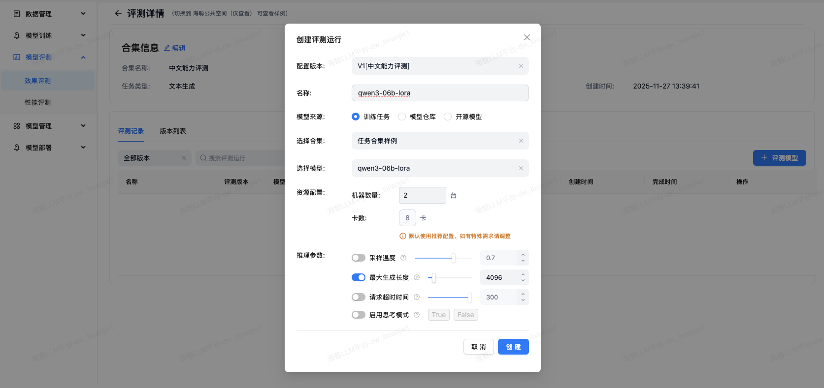可选择多种模型来源,支持多机多卡推理以及推理参数配置。