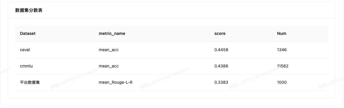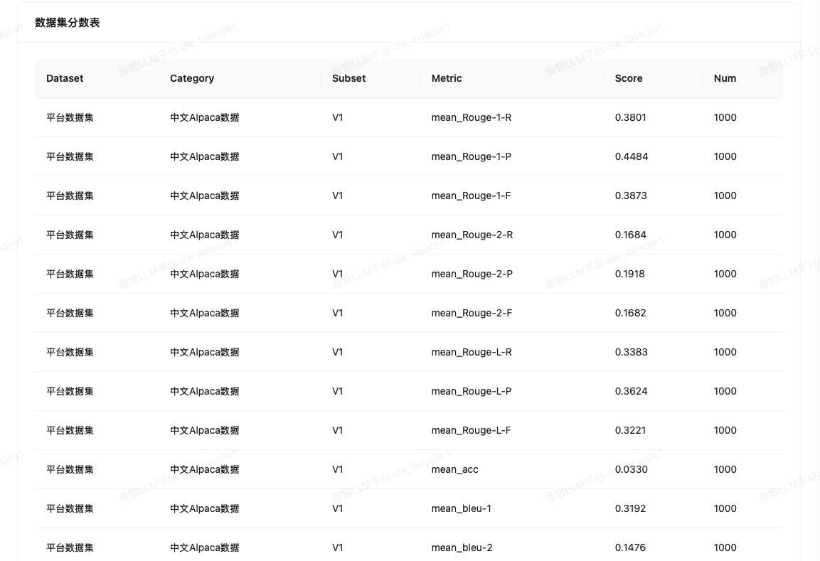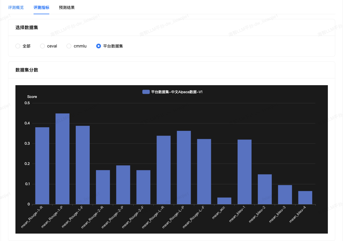 支持行业基准测试以及自定义数据集测试,行业基准使用预置指标,自定义数据集测试支持auc、bleu、rouge指标。