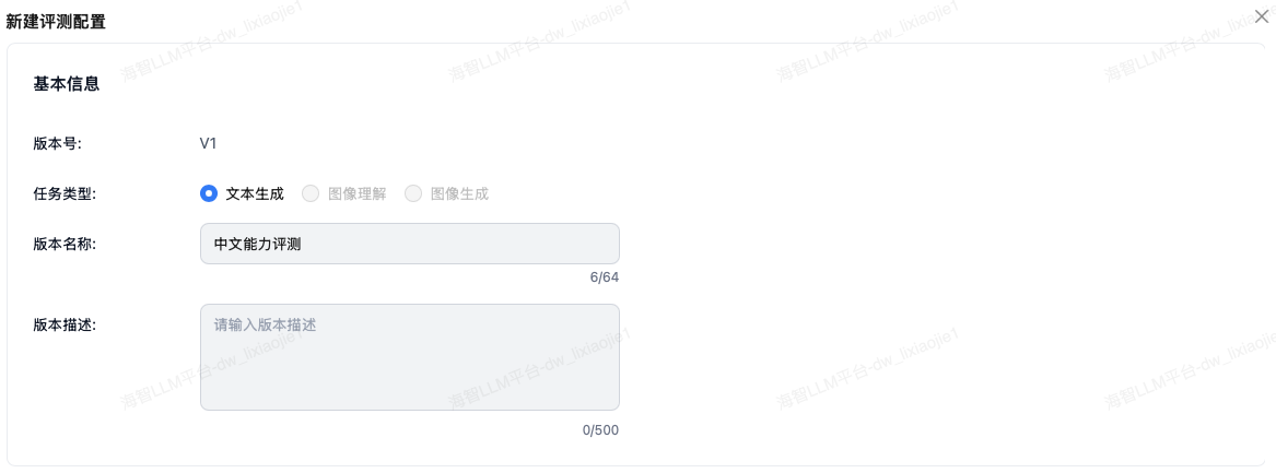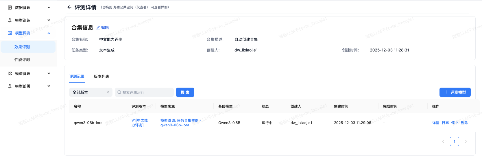 评测详情页分为评测记录和版本列表,评测记录为单次进行的模型评测,版本列表为不同的评测模版。